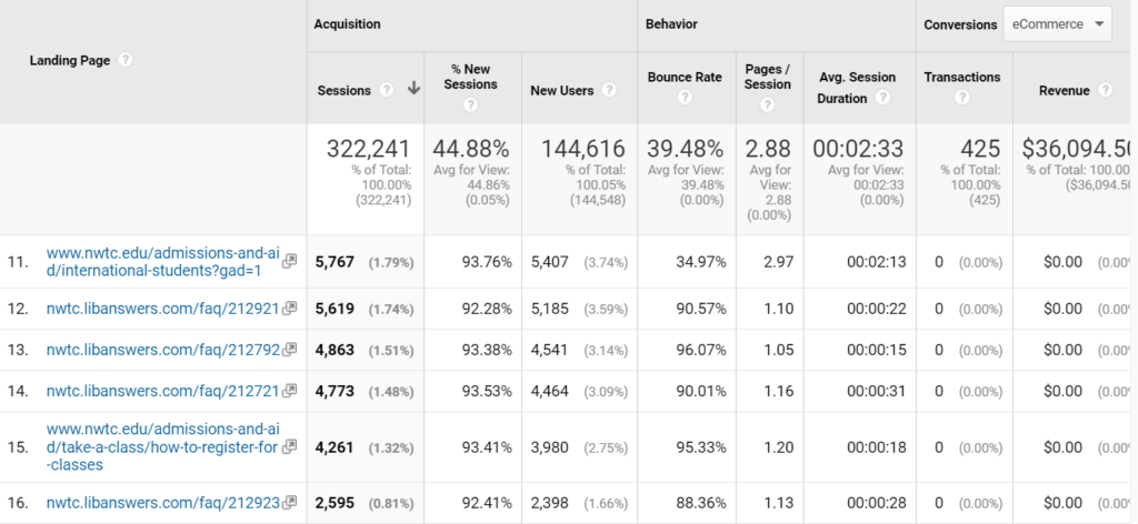 A recommendation I have for the NWTC website is to improve the “How to Register for Classes” page as a landing page. This page ranks at #15 on the landing pages chart (using data from the last month). Improving the page content could possibly improve its numbers.